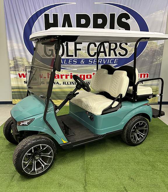 Check out this 2023 MadJax Series vehicle with a seafoam green body, the white premium seat upgrade and extended white rooftop. It comes with the three year MadJax warranty.